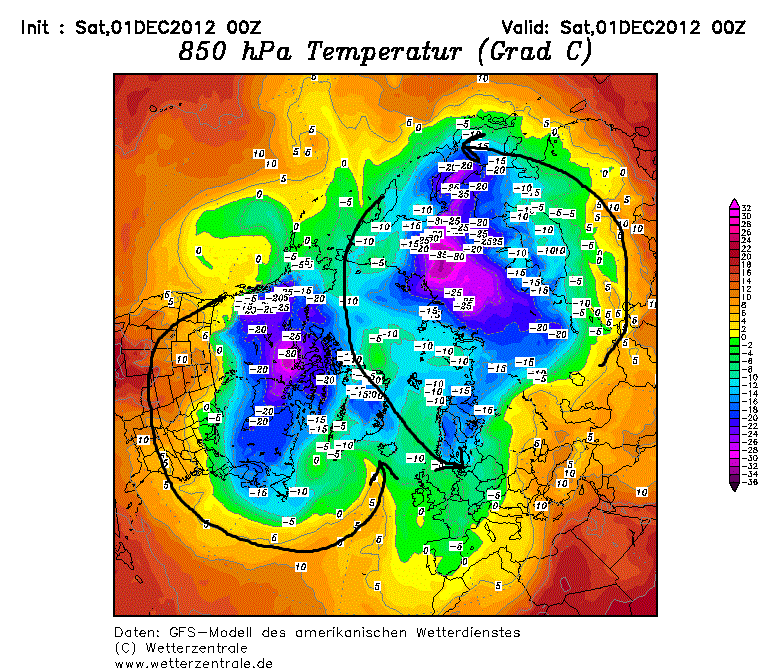Dieses Tief über der Arktis entsteht im Winter, wenn die Luft dort stark abkühlt und sich so zu sagen komprimiert, weil kältere Luft eine höhere Dichte hat. Wenn der warme Luftstrom aus Süden zu stark ist und das Meer noch nicht gefroren ist, kann dieses Tief in zwei gespaltet werden und so entstehen zwei Wirbel und dann spricht man vom Polarwirbelsplit. Diese Konstellation bevorzugt kühlere Nordwinde über Mitteleuropa und lässt bei uns die Temperaturen fallen. Jedoch bedeutet ein Polarwirbelsplit nicht, dass es bei uns einen strengen Winter gibt. Es hängt von den Strömungen ab und der Kaltluftvorstoß kann auch eher östlich stattfinden und wir wären auf der warmen Vorderseite, wie hier zb der warme (orange) Keil über dem Atlantik.